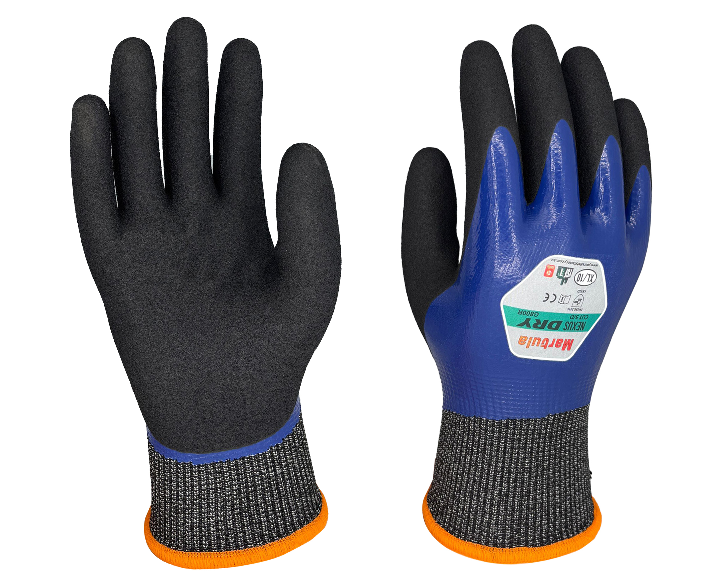 Our Nexus DRY Cut Resistant Gloves C5/D are coated with a sandy nitrile coating for superb wet and dry grip, and a smooth nitrile waterproof outer finish combined with chem proof inner coating – the best choice for working with liquids or in the wet. Made from 15 gauge high-performance polyethylene (HPPE), these gloves provide great dexterity, flexibility and breathability too. The Nexus DRY Cut Resistant Gloves provide the high-level of resistance to abrasion and tear (EN388 Level 4), and high-level cut protection (Level D).